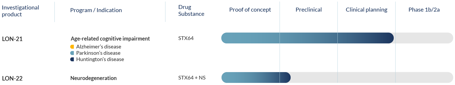 Our drug development program includes different indications and formulations to address one of the biggest medical challenges of our time: a way to restore the impairment of cognitive functions in the brain or, at least, to stop the progression of neurodegenerative disease.